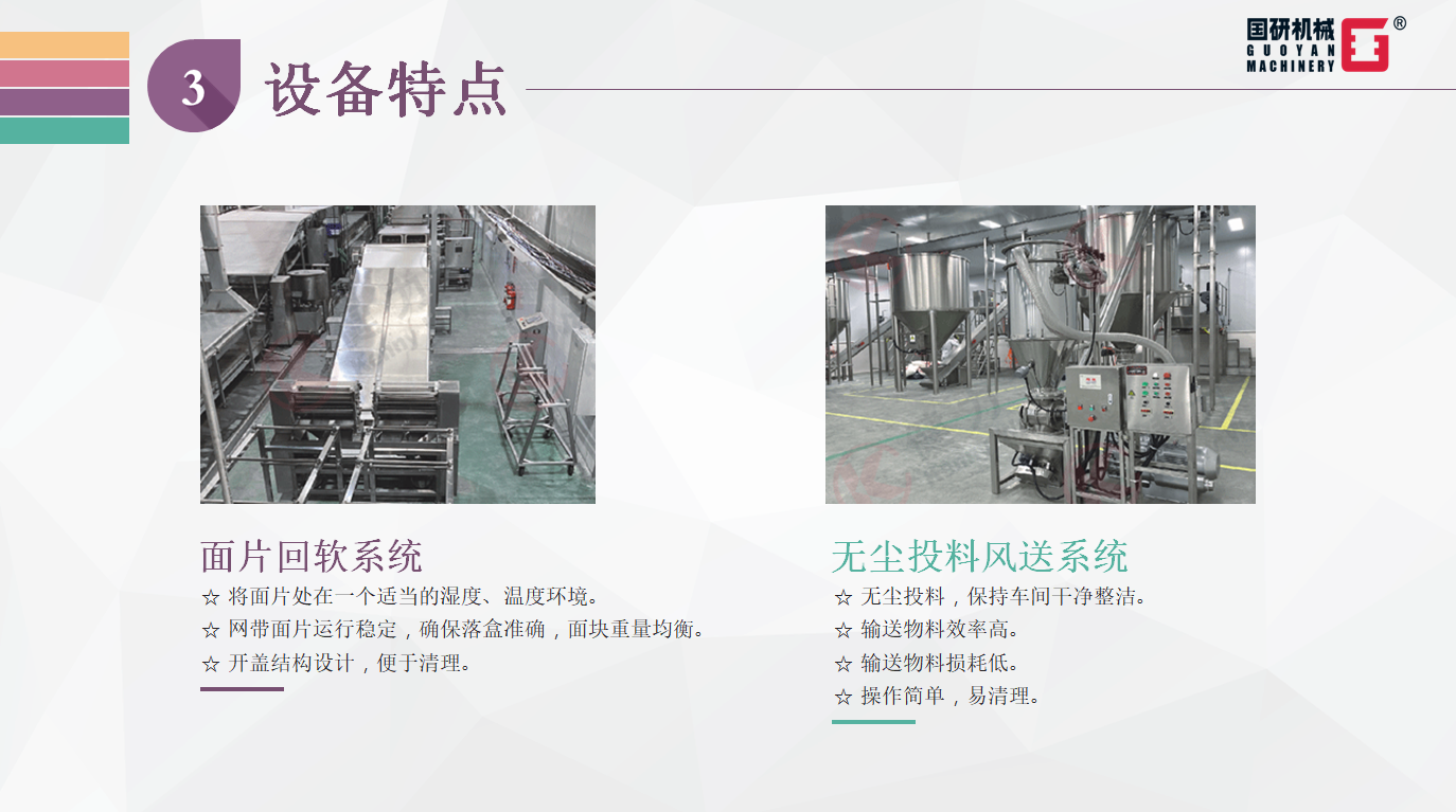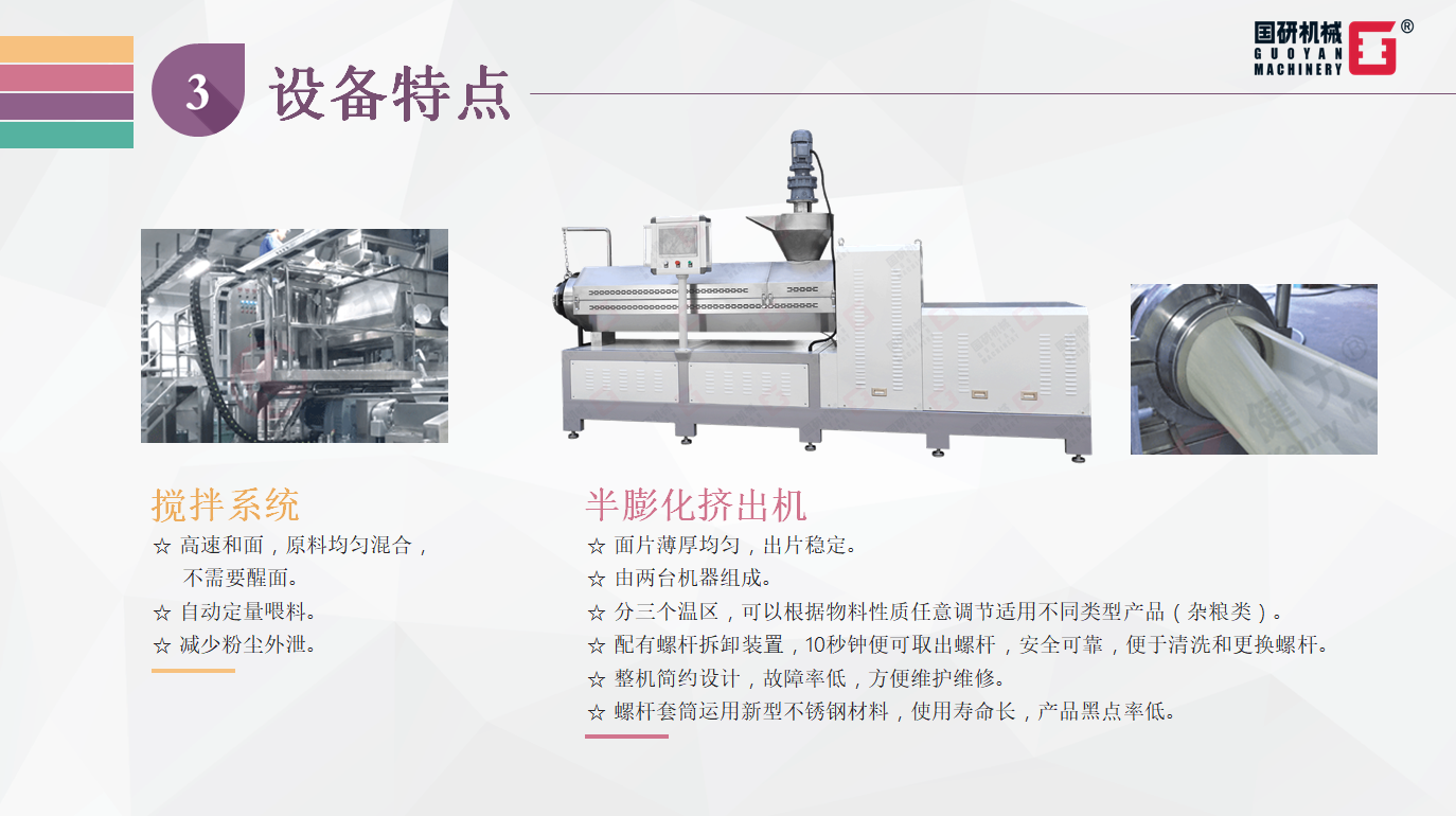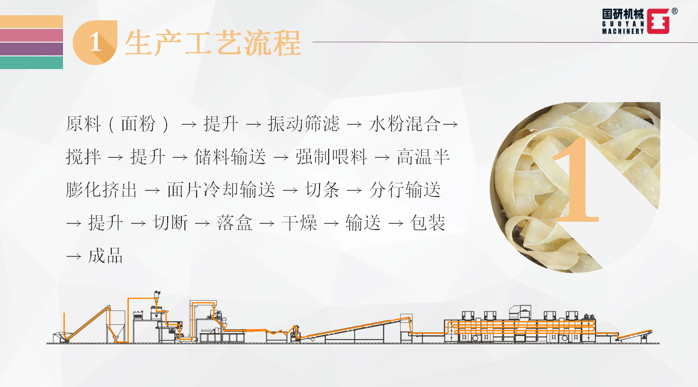 高温半膨化非油炸方便面生产线,是集自动和面、自动加料、挤压膨化、面片冷却输送、自动切条、分行输送自动提升、加湿回软切断、自动落盒成形、自动干燥到成品输送入包装于一体的全自动生产线。该设备主要应用于挤出式非油炸快食面的生产,工艺流畅、功能齐全、自动化程度高,机器出品稳定,工艺技术强于国内同类生产设备,是油炸方便面厂家更新换代的理想选择。